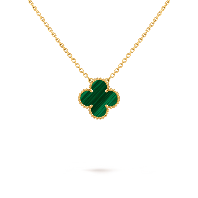 こちらはヴィンテージ アルハンブラコレクションよりマラカイトを用いたペンダントです。 イエローゴールドで縁取られた“四つ葉のクローバー”の中にひとつひとつ個性の異なるマラカイトの美しい グラデーションが魅力的な一品です。